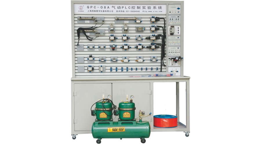 空气过滤、减压、油雾器三联件,减压阀,手动换向阀,电磁换向阀,气控换向阀,行程阀,单向阀,节流阀、单向节流阀、快速排气阀,或门型梭阀,单作用气缸,双作用气缸、旋转气缸,行程开关(常闭、常开)等。元器件都固定在元件板上。