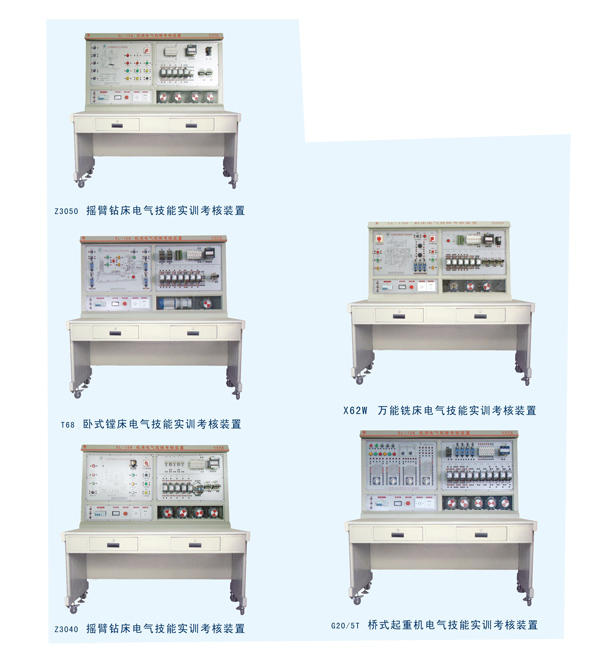 装置配备 1. 桌身部分:采用优质钢板做骨架,经过机械加工成型,外表面喷涂彩色环氧聚塑,整机既坚固耐用,又美观大方;设有两个大抽屉和1个大 柜桶,分别用于放置工具及挂箱等。桌子的底部采用带刹车的万向轮,移动和固定两相宜,方便调整设备的摆放位置。 2. 桌面部分:采用25mm厚高密度纤维板外贴进口防火板,PVC截面封边,桌边鸭嘴型设计。桌面具有耐磨、耐热、耐污、耐烟灼、耐火、耐 菌、防霉、抗静电及易清洁等特点。 3. 实验屏部分:钢质结构,外形美观、坚固耐用。 (1)输入电源: 三相四线380V±10% 50Hz交流电源。 (2)电流型、电压型漏电保护器:对漏电现象和短路故障进行保护,使装置自动跳闸,切断电源。 (3)故障开关箱:设有故障设置开关,可设置几十种短路开路故障; (4)输出电源:三相四线电源,380V/1.5A。单相220V电源。 (5)主要电器元件均采用中国国标元件,保证质量和技术参数要求。 (6)控制机构。 (7)执行机构。 (8)开关电源。 (9)设备规格:1400×700×1500(mm)。 4.挂箱部分:铝质结构,重量轻,移动方便。 (1)挂箱尺寸:655×555×75(mm)。
